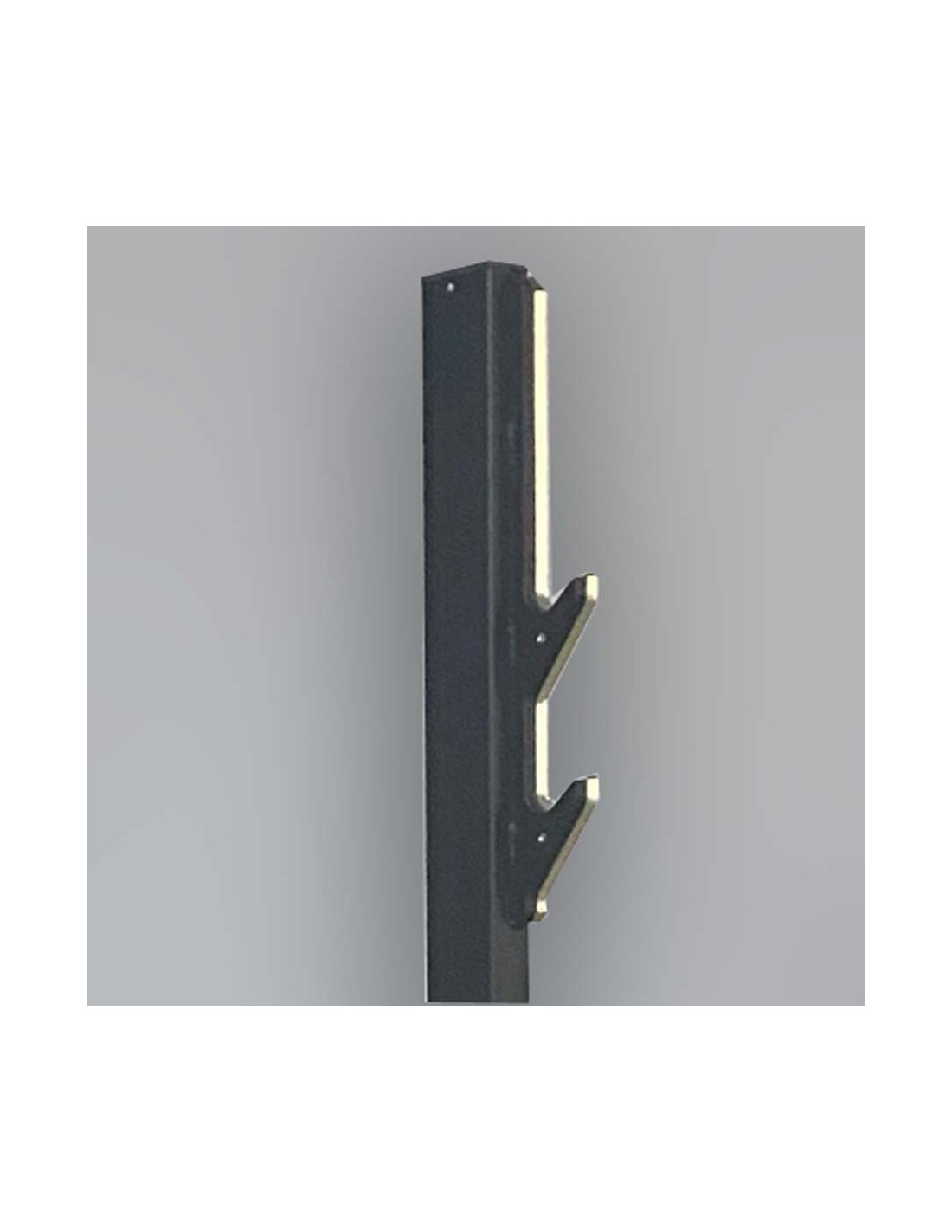 - Стойки тренажёра оборудованы стальными крюками для штанги, выполненными в виде гребёнки.