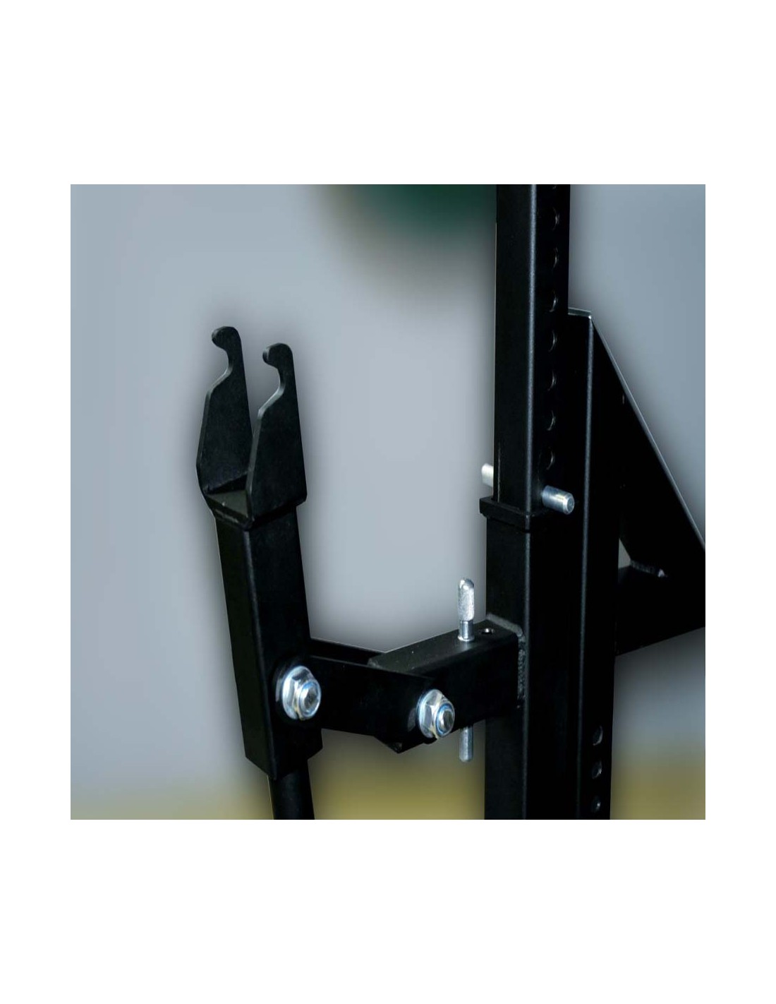 - Для удержания штанги на стойках вместо стальных крюков применён специальный рычажный механизм из нержавеющей стали, который позволяет поднимать и опускать штангу весом до 600 кг вместе дисками одному человеку.