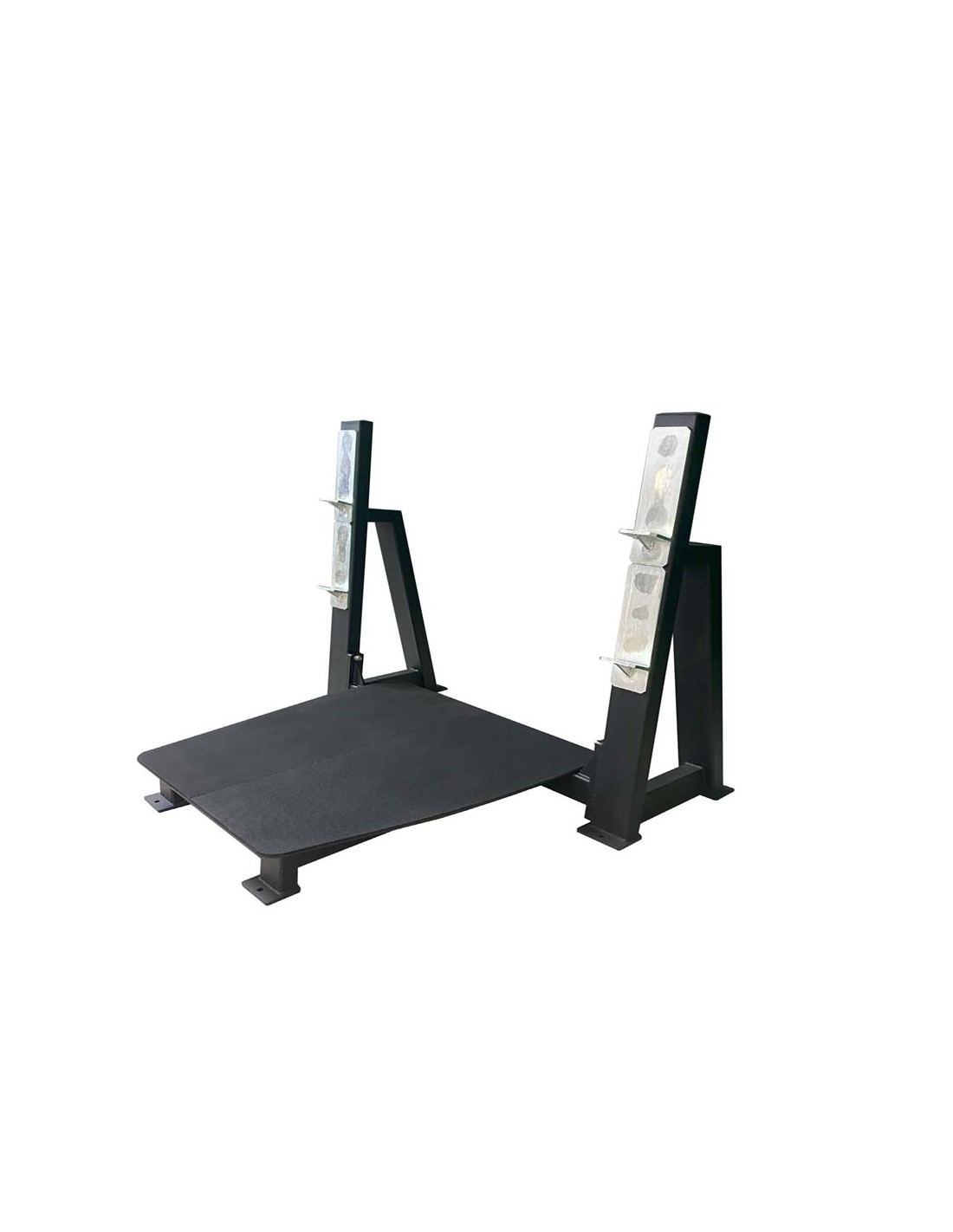 - Все части тренажёра покрыты полимерным покрытием за исключением обрезиненной платформы и отбойных пластин с держателями для штанги, которые оцинкованы.
